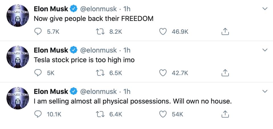 Tesla stock price is too high imo Elon Musk elonmusk May 1 2020. Many people misinterpreted Musks tweet. This is so bizarre.